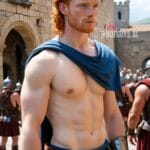In the bustling heart of ancient Rome, a young, 20-year-old shirtless Roman soldier stands in the town square, his muscular physique a testament to years of dedicated training. Ready and poised, he embodies the spirit of determination and the solemn promise to protect his empire. Surrounded by the vibrancy of Roman life, his presence is a powerful reminder of the strength and vigilance that keep the city safe.
